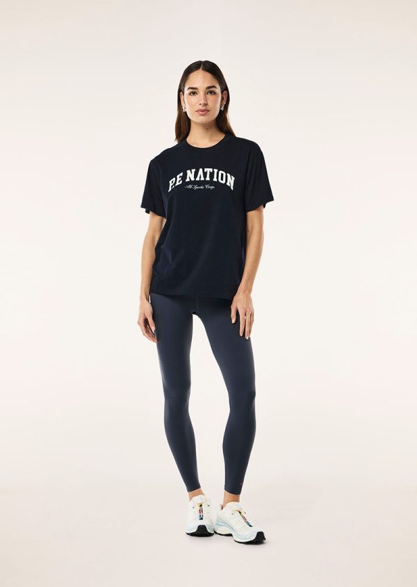 The Heritage Tee in Dark Sapphire is crafted in our new midweight ,100% organic cotton jersey fabrication. This relaxed fit crew neck tee features a P.E Nation seasonal logo at the center front. Wear yours with active leggings for an easy athleisure look.