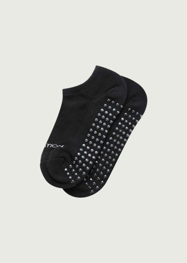 The Homage Grip Ankle Sock in Black is a cotton-blend rib crew sock, with silicon grips on the sole, perfect for Pilates. Featuring signature P.E Nation branding and bold stripe detailing, this sock is great for your next class.