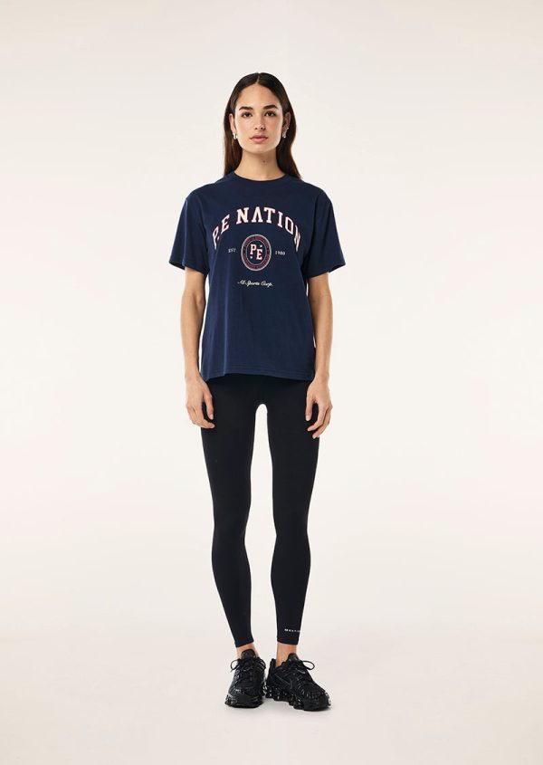 The Liberty Tee in Dark Navy is made from medium-weight cotton jersey, this relaxed fit tee features a rib crew neck and a centre front P.E Nation seasonal graphic. Ideal for exercising or lounging, style this tee with a bike short or trackpant for all-day wearing comfort.