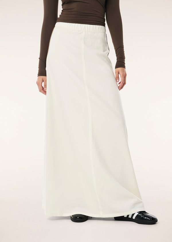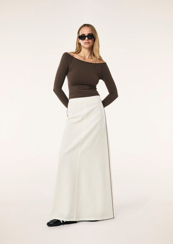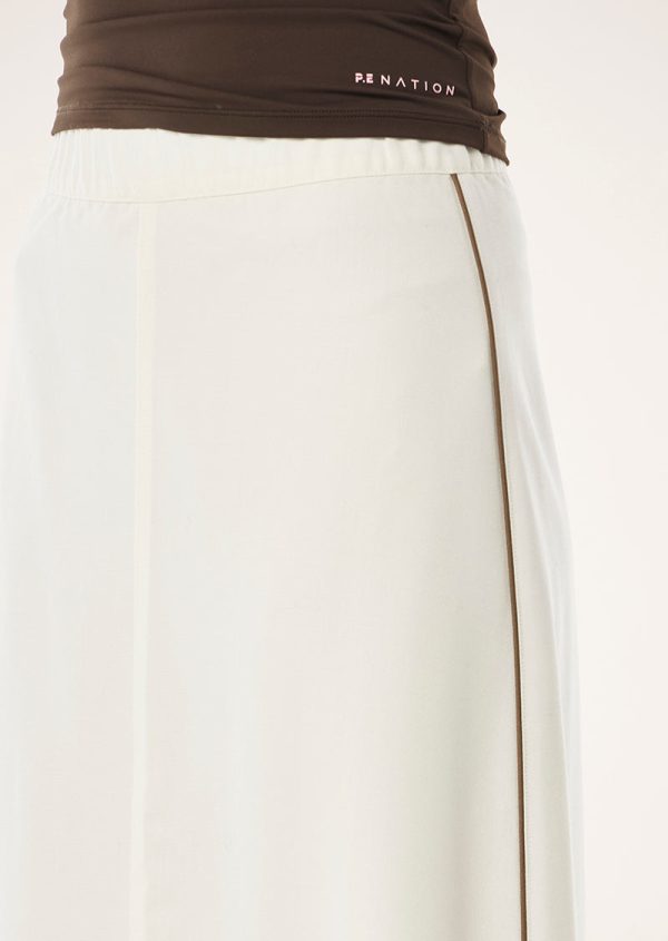 The Residency Skirt in Whisper White is made from a lightweight suiting fabric. This maxi skirt features a contrasting piping on the side hem, a front panelling detail and zipper at rear. Style this skirt with the Aura Top for an elevated athleisure look.