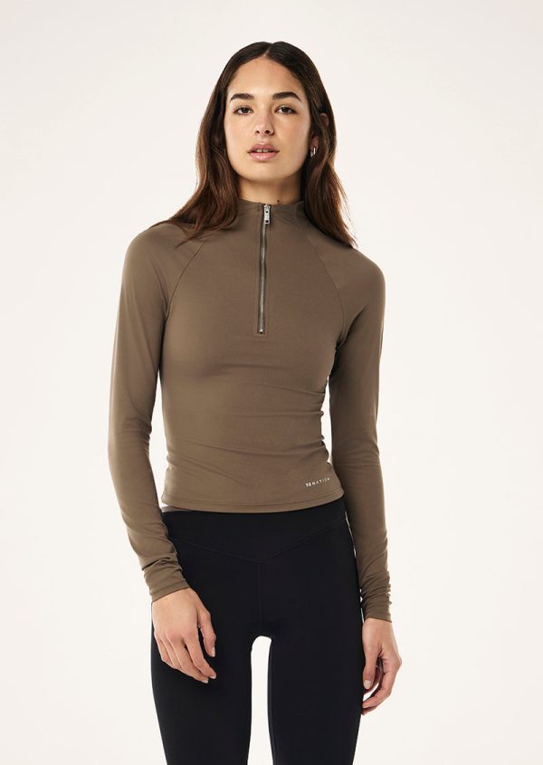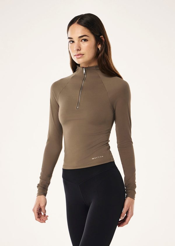 The Routine Quarter Zip Long Sleeve Top in Walnut is crafted from our ActiveLite fabrication. This fitted active top features a sleek quarter-zip front, raglan sleeves, and a high collar for a refined, sporty aesthetic. Versatile and elevated, it’s perfect for layering over activewear or pairing with your favorite pants for a dynamic all-day look.