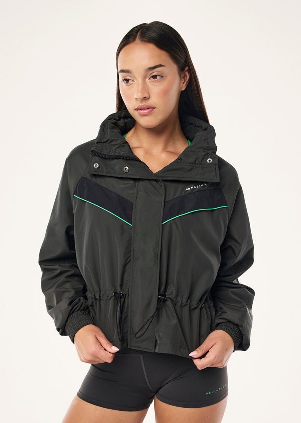 The Shelter Jacket in Caviar is designed in our signature water resistant spray fabric, this cropped jacket features contrast chevron panelling, a hidden chest pocket, an elasticated drawcord waist and a packable hood. Wear your jacket over activewear for an elevated athleisure look.