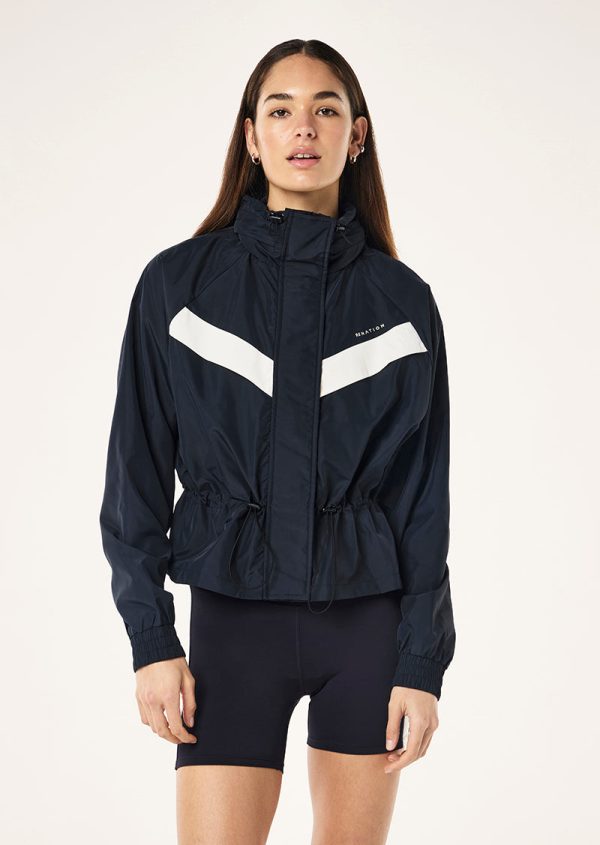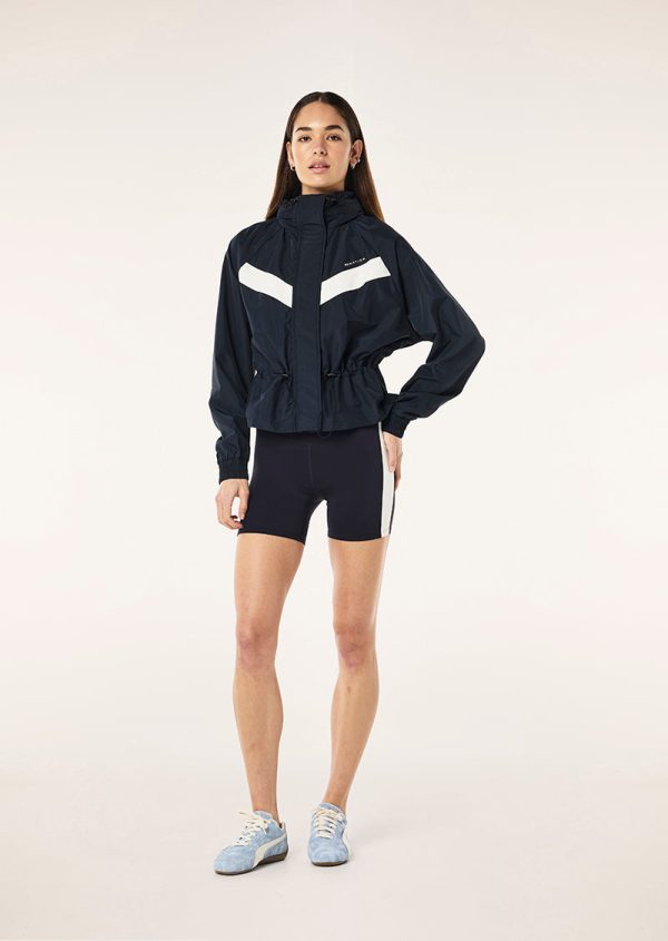 The Shelter Jacket in Dark Sapphire is designed in our signature water resistant spray fabric. This cropped jacket features contrast chevron panelling, a hidden chest pocket, an elasticated drawcord waist and a packable hood. Wear your jacket over activewear for an elevated athleisure look.