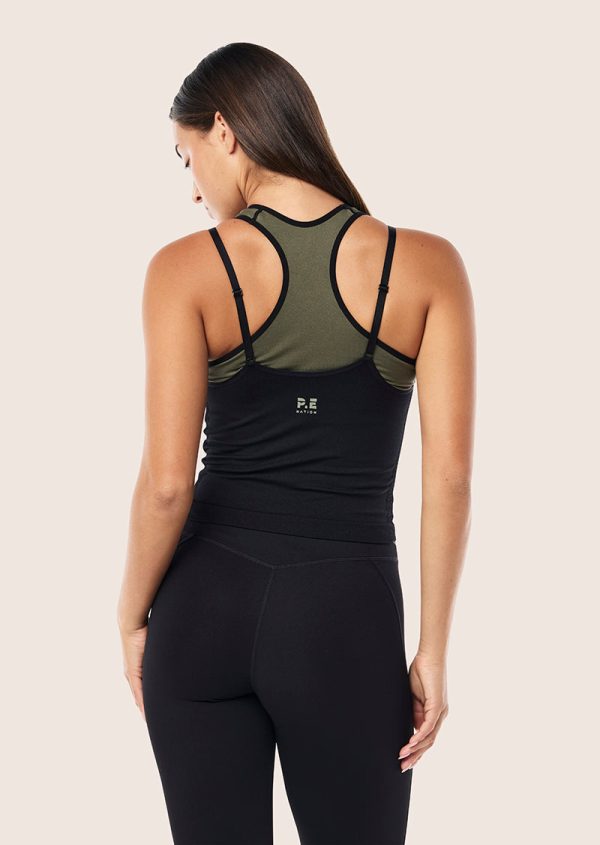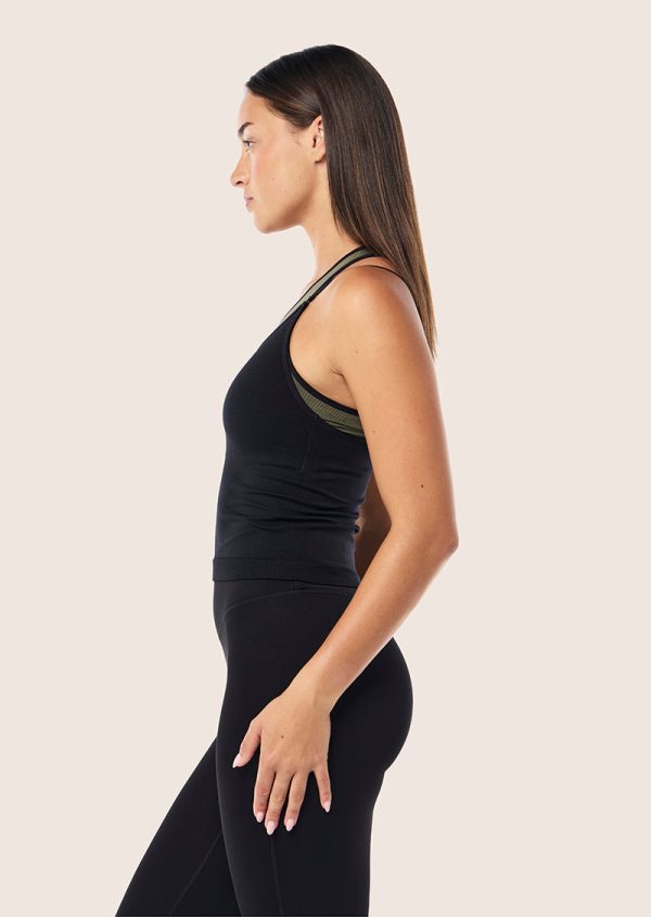 The Sutton Tank in Black is designed from our lightweight seamless fabrication. This tank features a flattering scoop neckline with contrasting double layer muscle tank shape underlayer with adjustable straps. Pair the tank with an active legging for your low intensity workouts or style with the Discovery pant for an elevated athleisure look.
